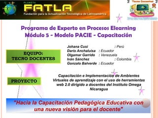 El documento aborda la capacitación docente en entornos virtuales a través del modelo PACIE, promoviendo el uso de herramientas web 2.0 y la implementación de un campus virtual. Se plantea un plan que incluye la formación continua de los docentes, la creación de un departamento especializado y la adquisición de recursos tecnológicos necesarios. Además, se detalla un contenido programático para la enseñanza del uso de Moodle y estrategias de sensibilización sobre la importancia de la educación virtual.