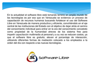 El documento habla sobre la capacitación de recursos humanos en software libre en Venezuela. Explica que el software libre está ganando terreno y que en Venezuela se está capacitando a las personas para fortalecer el uso del software libre de manera productiva y eficiente. La Academia de Software Libre ofrece capacitaciones presenciales y en línea en diversas áreas tecnológicas de manera gratuita dirigidas a estudiantes, profesionales y público en general.