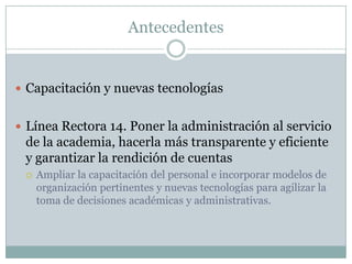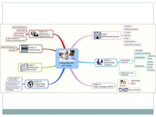 Este documento describe un proyecto para ampliar la capacitación del personal mediante cursos en línea. El proyecto tendrá 7 fases que incluyen definir objetivos, diseñar el modelo educativo, desarrollar una plataforma de aprendizaje, elaborar cursos, realizar una prueba piloto y dar seguimiento al programa de capacitación en línea. El objetivo general es que la Dirección General de Personal ofrezca capacitación en línea a más miembros del personal de manera efectiva y con aprendizaje significativo.