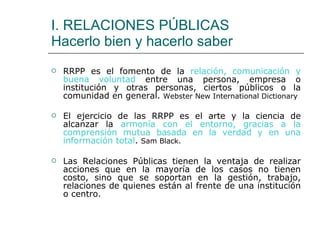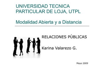 El documento resume las actividades de relaciones públicas de la Universidad Técnica Particular de Loja (UTPL) en Ecuador. La UTPL coordina un plan de relaciones públicas a nivel nacional que incluye publicaciones en medios, cultivar contactos con periodistas, y difundir información relevante. Los coordinadores de los centros asociados de la UTPL son los voceros de la universidad y deben transmitir su mensaje e imagen positiva. La UTPL ha incrementado su presencia en medios impresos, radio, televisión y web en los últimos años.