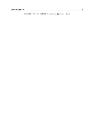 Este documento presenta una introducción a los sistemas de posicionamiento global (GPS), sistemas de información geográfica (SIG) y su aplicación. Explica conceptos clave como coordenadas geográficas, proyecciones cartográficas, elipsoides y datums. También describe las características y funcionalidades del equipo GPS Garmin GPSMap 60 y del software MapSource, incluyendo la captura, edición y visualización de datos geoespaciales.