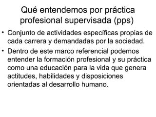 El documento proporciona información sobre la práctica profesional supervisada (PPS). Explica que la PPS incluye actividades específicas de cada carrera y es importante tanto social como académicamente. También describe el proceso de PPS, que incluye recibir un seminario, ser aceptado en una empresa, elaborar un perfil de funciones, y solicitar autorización de la universidad.