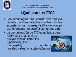 El documento describe las tecnologías de la información y la comunicación (TIC) y su aplicación en la educación. Explica que las TIC incluyen internet, multimedia e hipertextos y facilitan el aprendizaje permitiendo el acceso remoto a recursos. También analiza las ventajas de las TIC como la formación individualizada y el trabajo colaborativo, así como desventajas como la dependencia tecnológica.