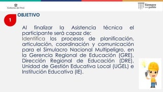 El documento describe los objetivos y procedimientos para la realización de un simulacro nacional multipeligro en instituciones educativas, enfocándose en la coordinación, comunicación y evacuación de estudiantes. Se menciona la importancia de la preparación, capacitación de brigadistas, y la ejecución de acciones de contingencia para asegurar la seguridad durante simulacros. Al finalizar, se evalúa la actividad con la participación de autoridades y se realizan reportes de participación y mejoras necesarias.