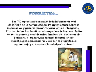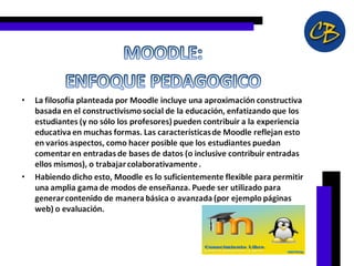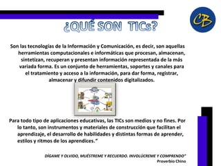 Las TIC son herramientas que procesan, almacenan y presentan información de forma digital. Son instrumentos que facilitan el aprendizaje al permitir la expresión, comunicación, productividad y acceso a recursos. Desde una perspectiva constructivista, las TIC pueden operar dentro de la zona de desarrollo próximo de los estudiantes y favorecer el aprendizaje colaborativo. Moodle es un ambiente educativo virtual de código abierto que ayuda a crear comunidades de aprendizaje en línea.