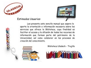 Este documento presenta un manual sobre los servicios de la biblioteca de una universidad. Explica que la biblioteca tiene una modalidad de estantería cerrada donde los usuarios deben solicitar los libros al bibliotecario. También describe el carné de biblioteca que los miembros de la comunidad universitaria necesitan para acceder a los servicios como el préstamo de materiales. Finalmente, resume los procedimientos para acceder a los recursos digitales de la biblioteca como el catálogo en línea y bases de datos a través de la página web de la biblioteca.