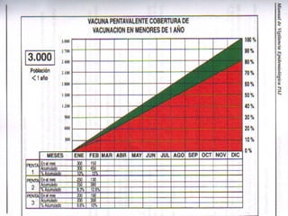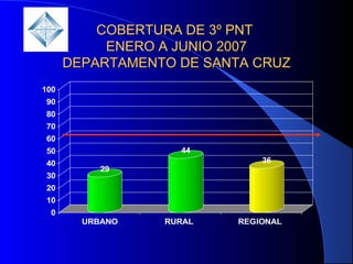 Este documento presenta información sobre la cobertura de vacunación del tercer punto de la vacuna pentavalente y la vacuna contra la fiebre amarilla en niños de 12 a 23 meses en el departamento de Santa Cruz, Bolivia, durante enero a junio de 2007. Muestra las coberturas por áreas (urbano, rural y regional), por municipios, y las coberturas específicas de SRP y fiebre amarilla. Adicionalmente, presenta indicadores sobre la cadena de frío y lineamientos sobre el Programa Ampliado de Inmunización.