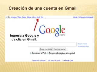 El documento describe los pasos para crear una cuenta de correo electrónico en Gmail. Estos incluyen ingresar a www.gmail.com, hacer clic en "Crear una cuenta", llenar los campos solicitados en el registro, y hacer clic en "QUIERO ACCEDER A MI CUENTA" una vez recibido el mensaje de confirmación. El documento fue creado por Cynthia, Patricia y Jocelyn como parte de un curso de capacitación en tecnologías aplicadas a la educación.