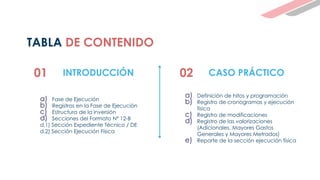(1) El documento presenta casos prácticos para el registro adecuado de la sección de ejecución física del Formato N° 12-B para obras ejecutadas bajo administración directa e indirecta. (2) Incluye información sobre las etapas, hitos y programación, así como el registro de cronogramas, avance físico y modificaciones. (3) También explica los pasos para definir los hitos y la programación inicial de una obra de mejoramiento de una institución educativa ejecutada bajo administración indirecta.