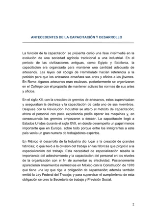 El documento trata sobre la capacitación y desarrollo del capital humano. Explica que la capacitación es importante para que las empresas sean productivas y competitivas. También describe los antecedentes históricos de la capacitación y los aspectos legales relacionados en México. Define la capacitación como un proceso para desarrollar las habilidades de los empleados y mejorar su productividad, mientras que el desarrollo se enfoca en preparar a las personas para puestos futuros.
