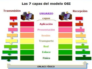 El documento describe las 7 capas del modelo OSI, desde la capa física que se encarga de las conexiones físicas y transmisión de bits, hasta la capa de aplicación que permite a las aplicaciones acceder a los servicios de las demás capas y define los protocolos de aplicaciones como correo electrónico y FTP. Cada capa se encarga de una función específica como el direccionamiento, control de errores, transporte de datos, mantenimiento de sesiones y representación de la información.