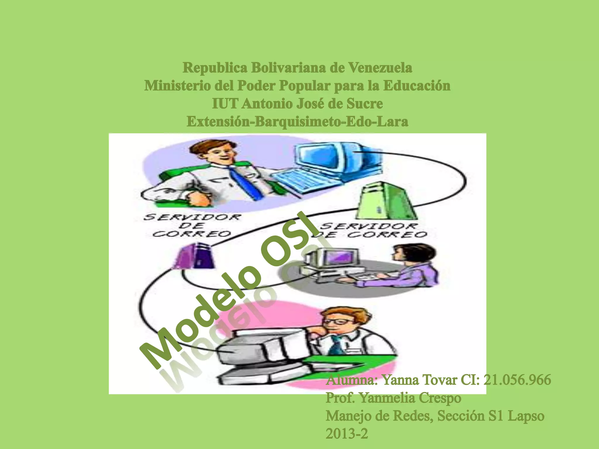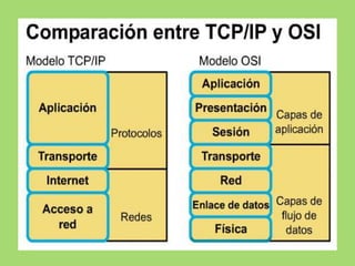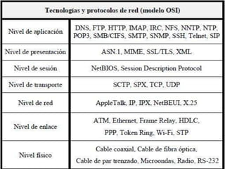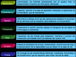 El documento describe el modelo OSI de 7 capas para la interconexión de sistemas abiertos. El modelo OSI divide el proceso de transmisión de información entre equipos informáticos en 7 capas, donde cada capa se encarga de una parte del proceso global. Las 7 capas son: la capa física, la capa de enlace de datos, la capa de red, la capa de transporte, la capa de sesión, la capa de presentación y la capa de aplicación.