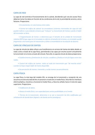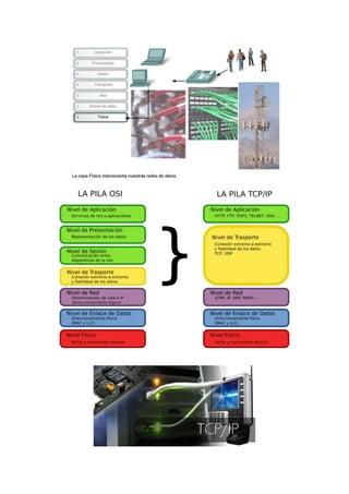 El documento describe las capas del modelo OSI y TCP/IP. El modelo OSI consta de 7 capas: aplicación, presentación, sesión, transporte, red, enlace de datos y física. El modelo TCP/IP consta de 4 capas: aplicación, transporte, internet e interconexión de redes. La principal diferencia es que TCP/IP combina algunas capas superiores del OSI.