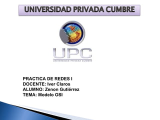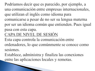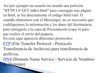 El documento describe los 7 niveles del modelo OSI, incluyendo una breve descripción de cada capa y ejemplos de dispositivos de red que operan en cada nivel. Se explican las funciones de la capa de aplicación, presentación, sesión, transporte, red, enlace de datos y física, así como ejemplos como gateways, firewalls, bridges, routers, switches y hubs.