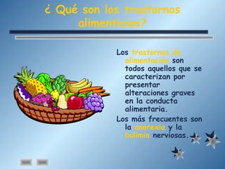 Este documento describe los trastornos alimenticios más comunes como la anorexia y la bulimia, incluyendo sus síntomas. Explica que se pueden prevenir inculcando buenos hábitos alimenticios desde la familia y la escuela, así como manteniendo una alimentación sana y equilibrada. Si se detecta un trastorno, la familia debe buscar ayuda profesional de manera comprensiva sin culparse.