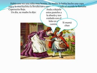Caperucita Roja se dirige a casa de su abuela con pasteles, pero se encuentra con un lobo. El lobo engaña a la abuela y se come a Caperucita. El cazador mata al lobo y rescata a la abuela y a Caperucita. Caperucita aprende la lección de no hablar con extraños.