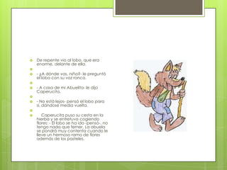 Caperucita Roja lleva pasteles a su abuela a través del bosque, pero se encuentra con un lobo que engaña a la abuela y se la come. Luego el lobo espera a Caperucita fingiendo ser la abuela, pero un cazador mata al lobo y rescata a la abuela y a Caperucita. Caperucita aprende la lección de no hablar con extraños.