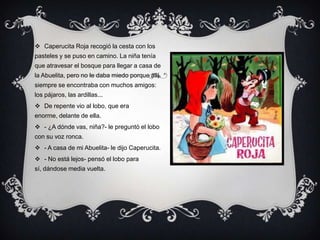 Caperucita Roja recibe de su madre pasteles para llevarle a su abuela a través del bosque, donde vive un lobo. El lobo engaña a la abuela y se come a Caperucita, pero un cazador las rescata cortando el vientre del lobo. El lobo es castigado llenándole el vientre de piedras y ahogándose cuando intenta beber. Caperucita aprende la lección de no hablar con extraños.