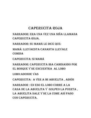 Caperucita roja recibe de su madre una canasta de comida para llevarle a su abuela enferma. En el bosque, el lobo le pregunta a Caperucita a dónde va y luego corre a la casa de la abuela. Allí, el lobo se come a la abuela y espera a Caperucita disfrazado, a quien también se come.