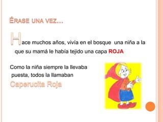Caperucita Roja lleva pasteles a su abuela a través del bosque, pero se encuentra con un lobo. El lobo se come a la abuela y la espera disfrazado en su cama. Cuando Caperucita Roja llega, el lobo también la come. Un cazador mata al lobo y rescata a Caperucita Roja y su abuela. Caperucita Roja aprende la lección de no hablar con extraños.