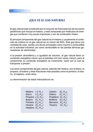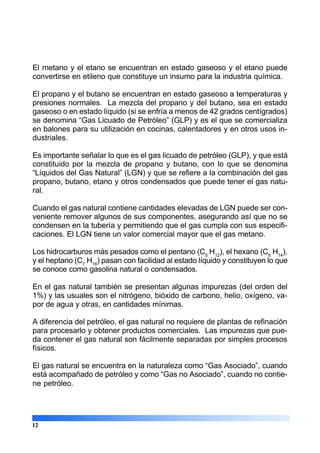 El gas natural está compuesto principalmente de metano y se usa comúnmente como combustible industrial y para generar electricidad. Puede transportarse por gasoductos a alta presión como gas o licuado como GNL a baja temperatura para su distribución a larga distancia. Es importante que los países aprovechen sus reservas de gas natural no solo para la exportación sino también para impulsar su desarrollo industrial y energético.