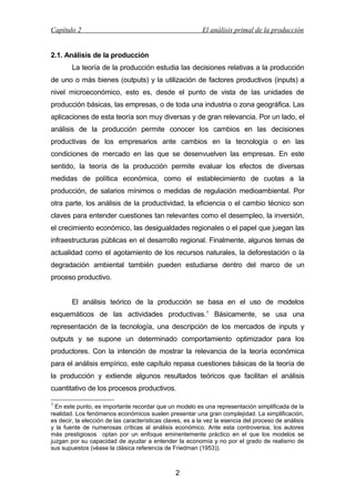 Este capítulo describe diferentes formas de representar la tecnología productiva y su aplicación en el análisis empírico. Se define la tecnología y las distintas formas de representarla matemáticamente, como la función de producción y la función de distancia. También analiza conceptos clave como las productividades marginales, los rendimientos a escala y las posibilidades de sustitución entre factores. Finalmente, introduce brevemente el análisis empírico de la producción.