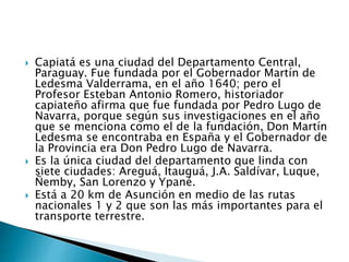 Capiatá es una ciudad fundada en 1640 ubicada a 20 km de Asunción, Paraguay. Es la única ciudad del departamento Central que limita con siete otras ciudades. Existen dos teorías sobre el origen de su nombre, una que deriva de un cacique y otra de palabras en guaraní relacionadas a la paja abundante en la zona. La ciudad cuenta con 254.000 habitantes y destaca por su museo Ramón Elías que preserva la memoria histórica paraguaya, así como las festividades del 2 de febrero en honor a su patrona