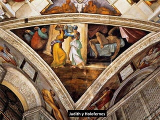 El documento resume los diferentes elementos pictóricos que adornan el techo de la Capilla Sixtina en el Vaticano. Describe las cuatro grandes escenas bíblicas en las esquinas del techo, así como las historias de David y Goliat y Judit y Holofernes en los lados opuestos. También menciona las figuras de profetas como Isaías y las sibilas paganas, así como los antepasados de Cristo que aparecen en la banda central entre las figuras desnudas conocidas como ignudi.