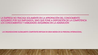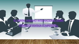 El documento discute el capital humano internacional y la importancia de la experiencia internacional entre los directivos de las organizaciones multinacionales. Explica que el personal cualificado debe considerarse un recurso estratégico valioso e insustituible. También describe diferentes tipos de expatriados, como los directivos expatriados, directivos globales e impatriados, y las políticas para desarrollar el liderazgo global como viajes internacionales, equipos internacionales, formación y transferencias internacionales.