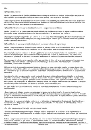 El documento describe las ventajas de usar Internet en la búsqueda laboral. Algunas de las principales ventajas son que es más barato que los métodos tradicionales, permite reducir los costos y el tiempo de los procesos de selección, y acelera el proceso de búsqueda laboral. También permite ofrecer más información a los candidatos potenciales y segmentar los anuncios para alcanzar candidatos más calificados.