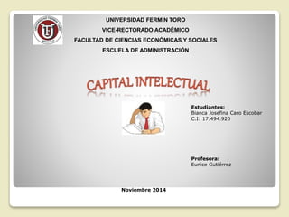 Este documento es una carta de la Universidad Fermín Toro dirigida a la estudiante Bianca Josefina Caro Escobar y su profesora Eunice Gutiérrez. La carta discute los tres tipos de capital que son importantes para una organización: capital humano, capital relacional y capital estructural.