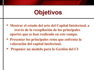 El documento trata sobre el capital intelectual. Explica que el conocimiento es un recurso económico clave y que la gestión del conocimiento es fundamental para el éxito de las empresas. Identifica tres tipos de capital intelectual: capital humano, capital estructural y capital relacional. También presenta varios modelos para medir el capital intelectual de una organización.