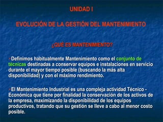 El documento describe la evolución histórica de la gestión del mantenimiento industrial desde finales del siglo XIX hasta la actualidad. Inicialmente, el mantenimiento se realizaba de forma reactiva una vez producida la avería. Posteriormente surgieron técnicas de mantenimiento preventivo para prevenir fallos. Más recientemente han aparecido enfoques como el mantenimiento predictivo, la gestión asistida por ordenador y el mantenimiento basado en la fiabilidad, que buscan optimizar los costes y la disponibilidad de los equipos.