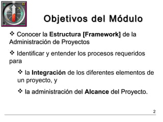 El documento describe la estructura, integración y alcance en la administración de proyectos. Explica que el Project Management Body of Knowledge (PMBOK) identifica los conocimientos requeridos en la administración de proyectos. El PMBOK incluye áreas de conocimiento como la gestión de la integración del proyecto y la gestión del alcance del proyecto.