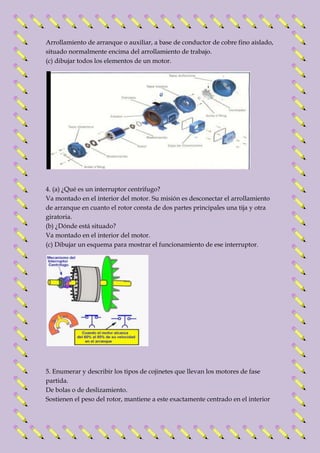 Este documento describe los motores de fase partida, incluyendo sus características, partes, funcionamiento y reparación. Explica que estos motores constan de dos arrollamientos estatóricos desfasados 90 grados eléctricos, y un interruptor centrífugo que desconecta el arrollamiento auxiliar una vez alcanzada la velocidad nominal. También detalla los pasos para la reparación, como tomar datos, extraer los arrollamientos, rebobinar e instalar los nuevos.