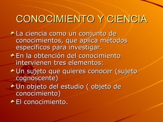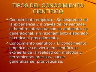 El documento describe los tipos de conocimiento científico. Explica que la ciencia aplica métodos específicos para investigar un conjunto de conocimientos. Identifica tres elementos en la obtención del conocimiento: un sujeto cognoscente, un objeto de estudio y el conocimiento en sí. Además, distingue entre el conocimiento empírico, que se desprende de la experiencia a través de los sentidos, y el conocimiento científico, que extrae la información empírica de la realidad usando métodos y herramientas precisos que permiten