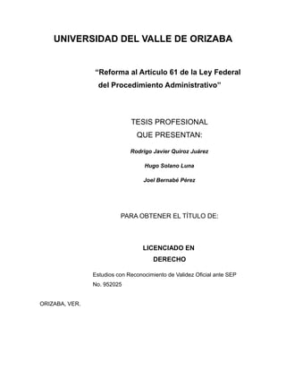 UNIVERSIDAD DEL VALLEDE ORIZABA “Reforma al Artículo 61 de la Ley Federal del Procedimiento Administrativo” TESIS PROFESIONAL QUE PRESENTAN: Rodrigo Javier Quiroz Juárez Hugo Solano Luna Joel Bernabé Pérez PARA OBTENER EL TÍTULO DE: LICENCIADO EN DERECHO Estudios con Reconocimiento de Validez Oficial ante SEP No. 952025 ORIZABA, VER.