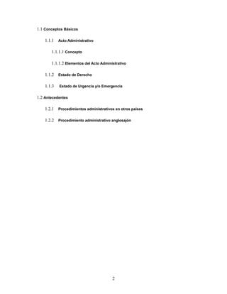 1.1 Conceptos Básicos 1.1.1 Acto Administrativo 1.1.1.1 Concepto 1.1.1.2 Elementos del Acto Administrativo 1.1.2 Estado de Derecho 1.1.3 Estado de Urgencia y/o Emergencia 1.2 Antecedentes 1.2.1 Procedimientos administrativos en otros países 1.2.2 Procedimiento administrativo anglosajón 2
