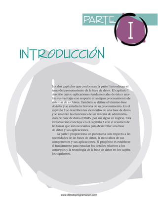 Este documento presenta una introducción al procesamiento de bases de datos. Explica cuatro ejemplos de aplicaciones de bases de datos, incluyendo una pintora de casas y una tienda de música. También describe los componentes clave de una base de datos, como tablas, sistemas de administración de bases de datos y aplicaciones. El objetivo es establecer los fundamentos para estudiar en más detalle los conceptos y tecnología de bases de datos en capítulos posteriores.