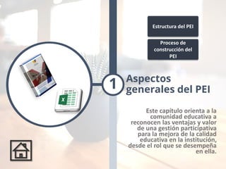 El documento describe el proceso de construcción de un Proyecto Educativo Institucional (PEI). Explica que el PEI es un instrumento de planificación estratégica participativa que orienta la gestión de una institución educativa. Detalla que el proceso de construcción del PEI involucra a la comunidad educativa y toma varios meses, durante los cuales se definen la visión, misión e ideario de la institución, así como los cinco componentes que conforman el PEI: gestión administrativa, pedagogía, convivencia escolar, servicios educat