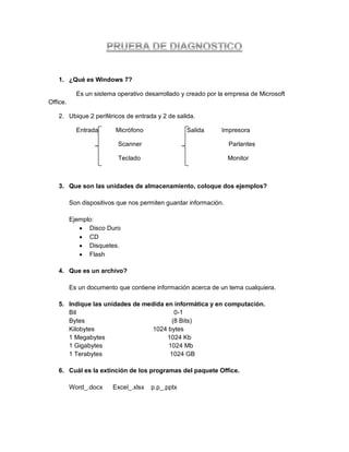 El documento describe Windows 7 como un sistema operativo desarrollado por Microsoft. Identifica micrófonos e impresoras como periféricos de entrada y salida. Las unidades de almacenamiento como discos duros y CDs almacenan información. Los archivos contienen información sobre un tema. Las unidades de medida en computación incluyen bits, bytes, kilobytes, megabytes, gigabytes y terabytes. Los programas de Office tienen extensiones como .docx, .xlsx y .pptx.