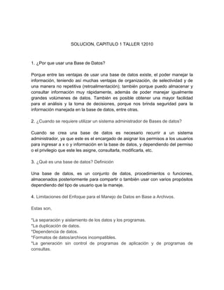 Este documento introduce los conceptos básicos de las bases de datos. Explica que una base de datos es un conjunto de datos almacenados para compartir y usar con varios propósitos. Se requiere un sistema administrador de bases de datos para asignar permisos a los usuarios y permitir el acceso, modificación y consulta de la información almacenada. Los lenguajes de bases de datos incluyen DDL para definir datos, DML para manipular datos, y VDL para definir vistas.