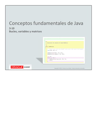Este documento discute los bucles en programación y diferentes métodos de bucle como for, while y do-while. Explica que los bucles se usan comúnmente para repetir secciones de código y que aunque los tres métodos pueden usarse para cualquier propósito, algunos son más adecuados para casos específicos. También cubre conceptos como ámbito de variables, uso de letras como "i" para contadores de bucle, y evitar bucles infinitos.