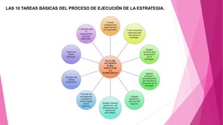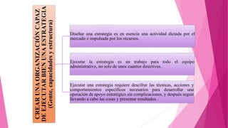 El documento describe tres tipos de acciones para crear una organización capaz de ejecutar bien una estrategia: 1) dotar a la organización de personal talentoso; 2) acumular competencias esenciales y capacidades para competir; y 3) estructurar la organización y el esfuerzo laboral. Se enfatiza la importancia de reunir un equipo administrativo sólido con la combinación correcta de experiencias, habilidades y capacidades, así como el proceso de varias etapas para crear nuevas competencias y capacidades que toma meses o años.