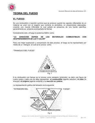 Este documento presenta un capítulo sobre la teoría del fuego. Explica que el fuego es una reacción química entre un combustible, oxígeno y calor. Representa el fuego mediante un triángulo o tetraedro donde cada lado representa un elemento necesario (combustible, oxígeno, calor, reacción en cadena). Describe estos elementos clave del fuego así como conceptos como la temperatura de ignición y las formas en que se transmite el calor.