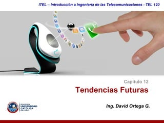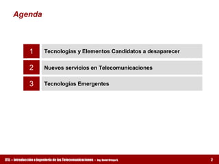 El documento aborda las tendencias futuras en telecomunicaciones, destacando la desaparición de tecnologías tradicionales como el cobre y la PSTN, y la transición hacia soluciones más avanzadas como la fibra óptica y redes de voz sobre IP. Se mencionan nuevos servicios como 'cuatro play' y 'telepresencia', y se introducen tecnologías emergentes como GPON e IPv6 que ofrecen mayor ancho de banda y conectividad. Asimismo, se discuten innovaciones como celdas femto para el hogar y el beamforming, que optimizan la cobertura y reducen costos.