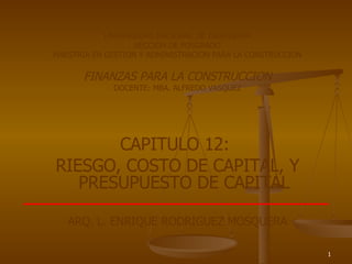 El documento trata sobre el costo de capital y su estimación. Explica que el costo de capital accionario de una empresa depende de la tasa libre de riesgo, la prima de riesgo del mercado y la beta de la empresa. También cubre cómo factores como el riesgo del negocio, apalancamiento operativo y financiero afectan la beta y el costo de capital. Finalmente, presenta un ejemplo del cálculo del costo de capital para la empresa "International Paper".