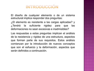 Este documento define conceptos fundamentales de resistencia de materiales como esfuerzo, deformación, elasticidad y ley de Hooke. Explica que el esfuerzo se define como la intensidad de fuerzas internas distribuidas que resisten un cambio de forma y se mide en fuerza por unidad de área. La deformación es el cambio de forma de un cuerpo debido al esfuerzo. La ley de Hooke establece que la deformación es proporcional a la fuerza aplicada hasta el límite de elasticidad de un material.