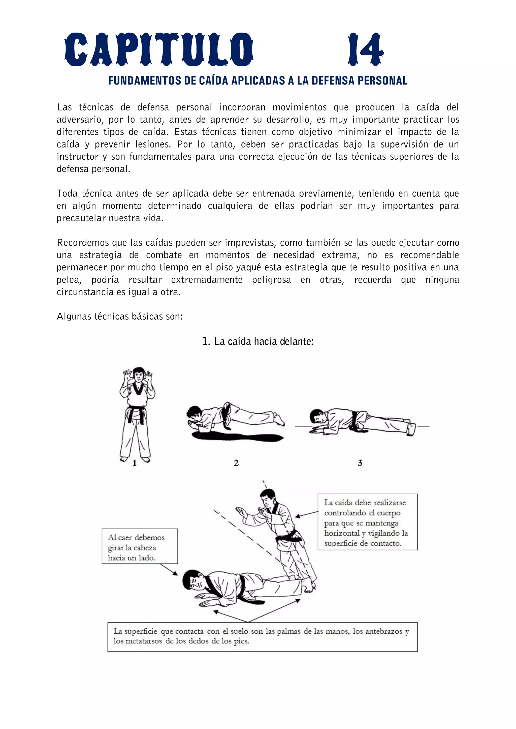 El documento describe la importancia de aprender diferentes tipos de caídas como parte de las técnicas de defensa personal para minimizar lesiones y ejecutar las técnicas superiores de forma correcta. Recomienda practicar las caídas bajo supervisión de un instructor y tener en cuenta que podrían ser necesarias para proteger la vida. Enumera algunas técnicas básicas de caída como hacia adelante, atrás, el lado, rodando y saltando.