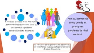 El documento resume los principales factores de riesgo de enfermedades cardiovasculares como la hipercolesterolemia, la hipertensión arterial, el tabaquismo y la diabetes. Explica que estos factores aumentan el riesgo de ateroesclerosis y crisis cardíacas. También describe las recomendaciones para la detección y control de estos factores de riesgo a través de exámenes de laboratorio, modificación de hábitos como dejar de fumar, hacer ejercicio y controlar el peso.